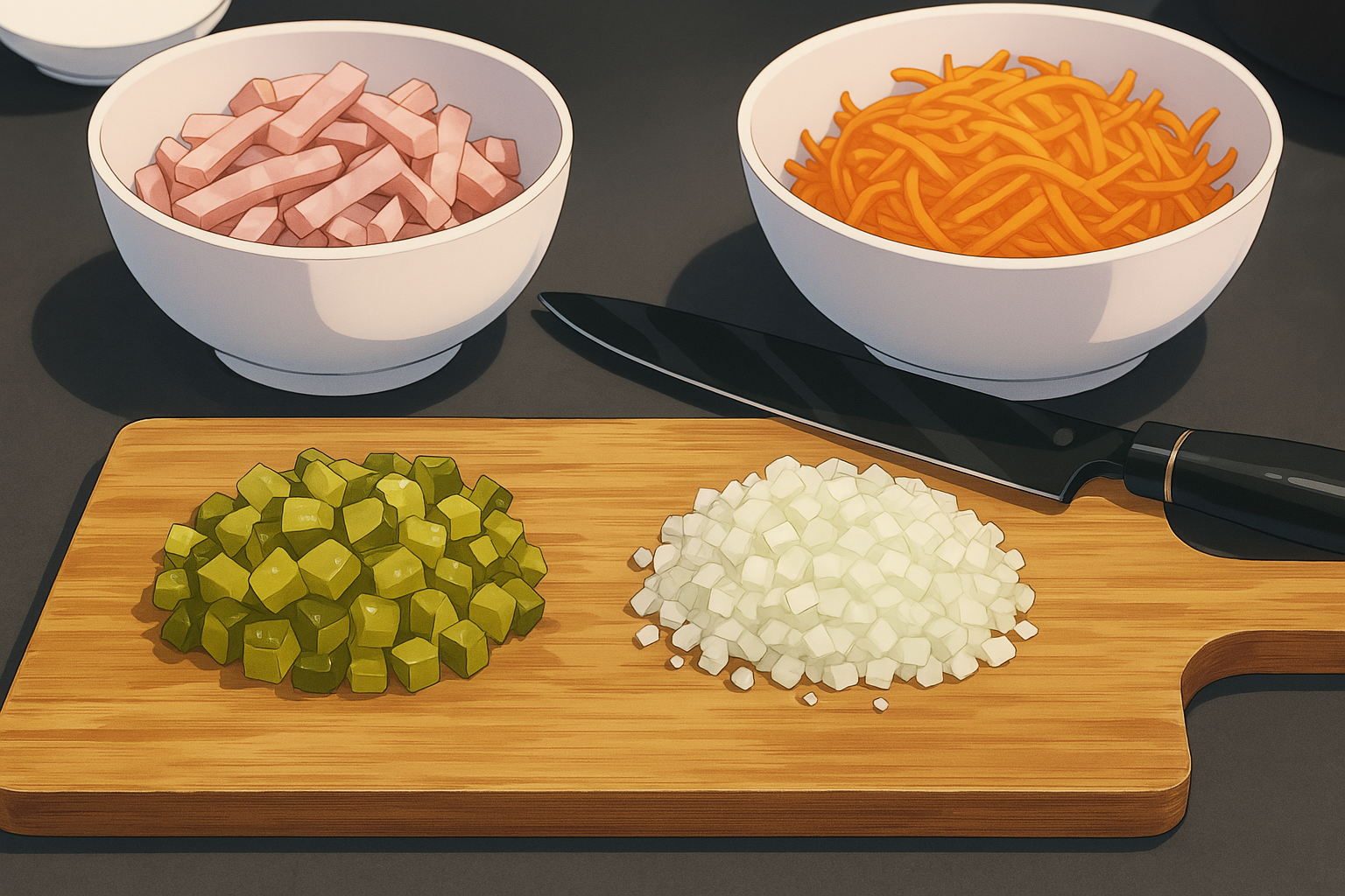 Sasmalcina sīpolu, sarīvē burkānus, gaļu un desu sagriež strēmelītēs, sagriež gurķus;