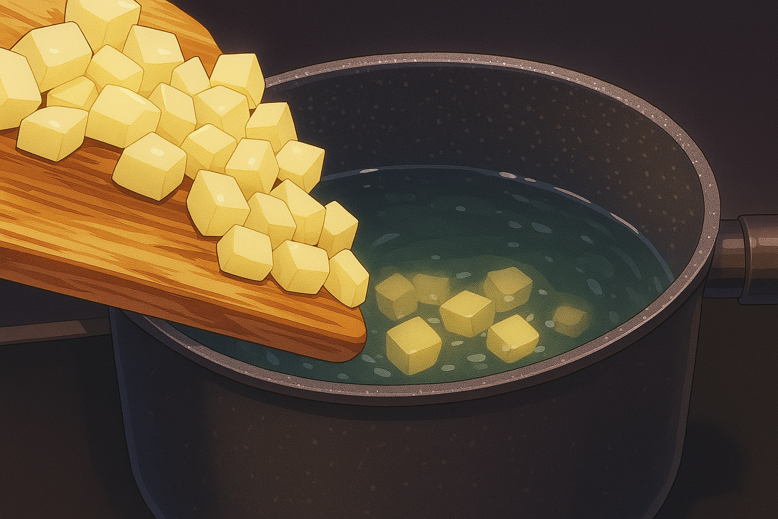 Kad katlā vārās ūdens, pievieno sāli un piparus, tad liek arī kartupeļus un visu, kas uz pannas;