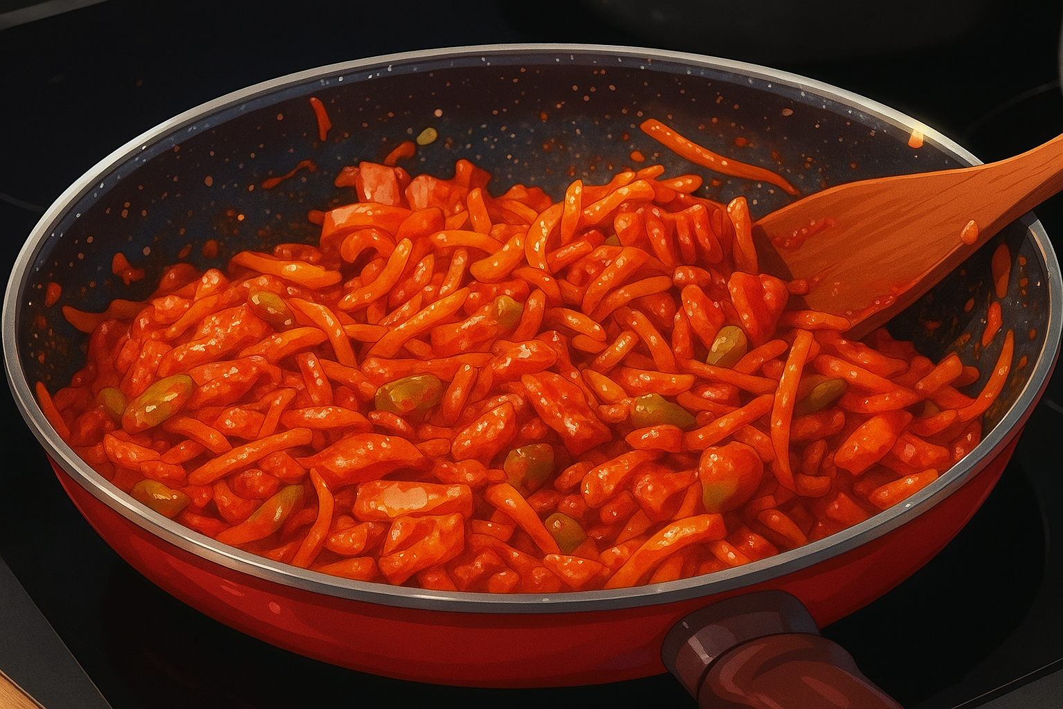 Pannā piespiež ķiploka daiviņu un pievieno tomātu pastu. Tad pasautē aptuveni 5 minūtes;