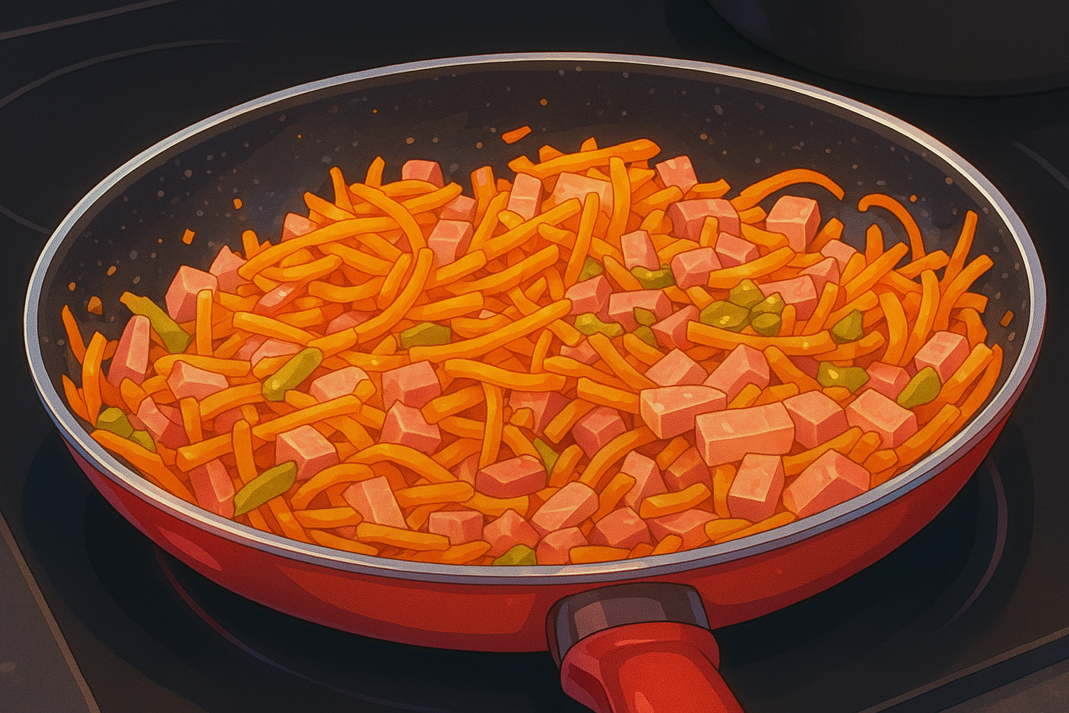 Vispirms apcep sīpolu, pēc tam pannā pievieno arī burkānus, gurķus, gaļu un desu. Tikmēr katlā liek vārīties ūdeni un kartupeļus sagriež nelielos kubiciņos;