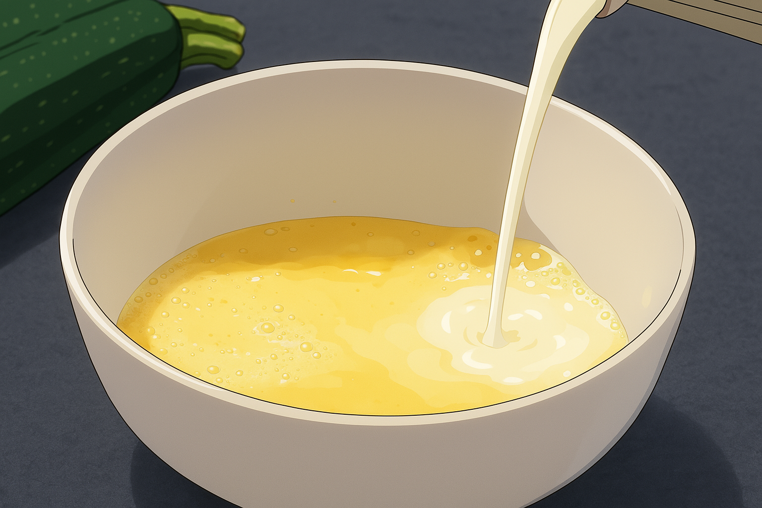 Nelielā bļodā iesit divas olas un sakuļ, tad pievieno saldo krējumu un sajauc vienmērīgā masā;