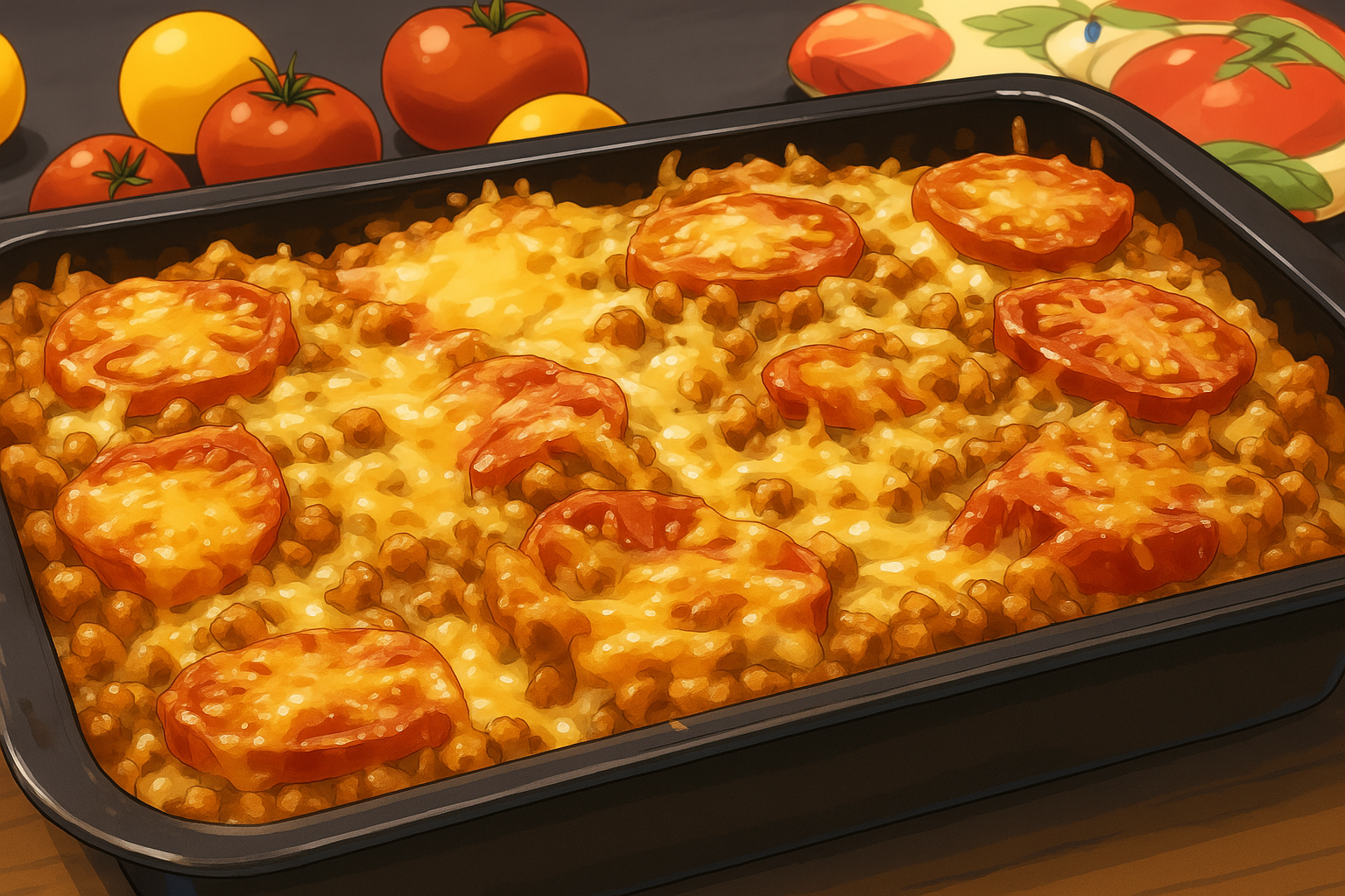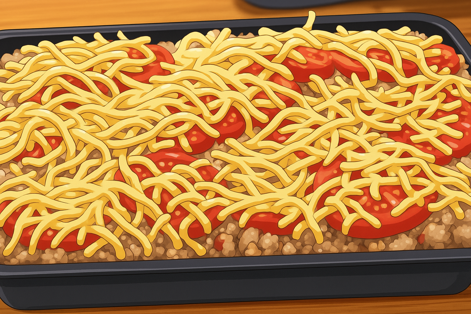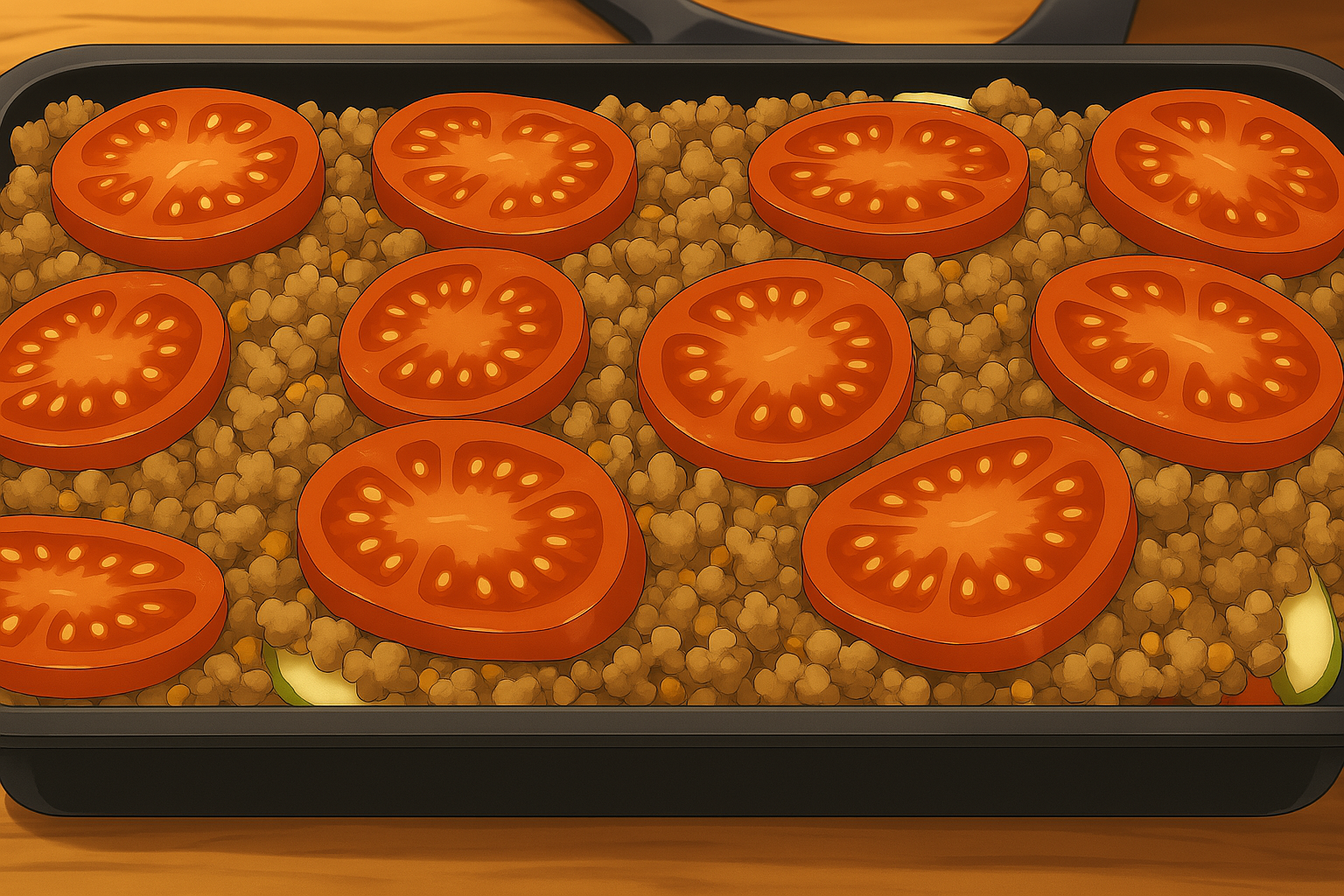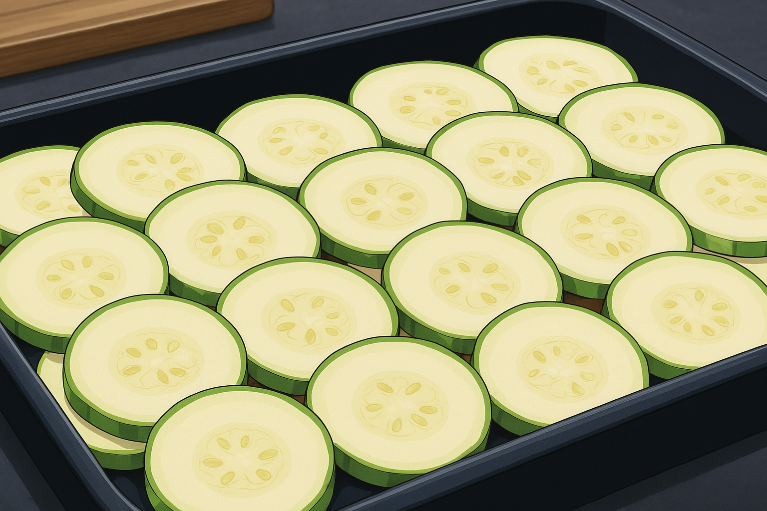 Cepeškrāsni silda līdz 190°C. Ieeļļo cepamtrauku un veido sacepumu 2 kārtās. Vispirms cepamtraukā izkārto kabaču šķēles;