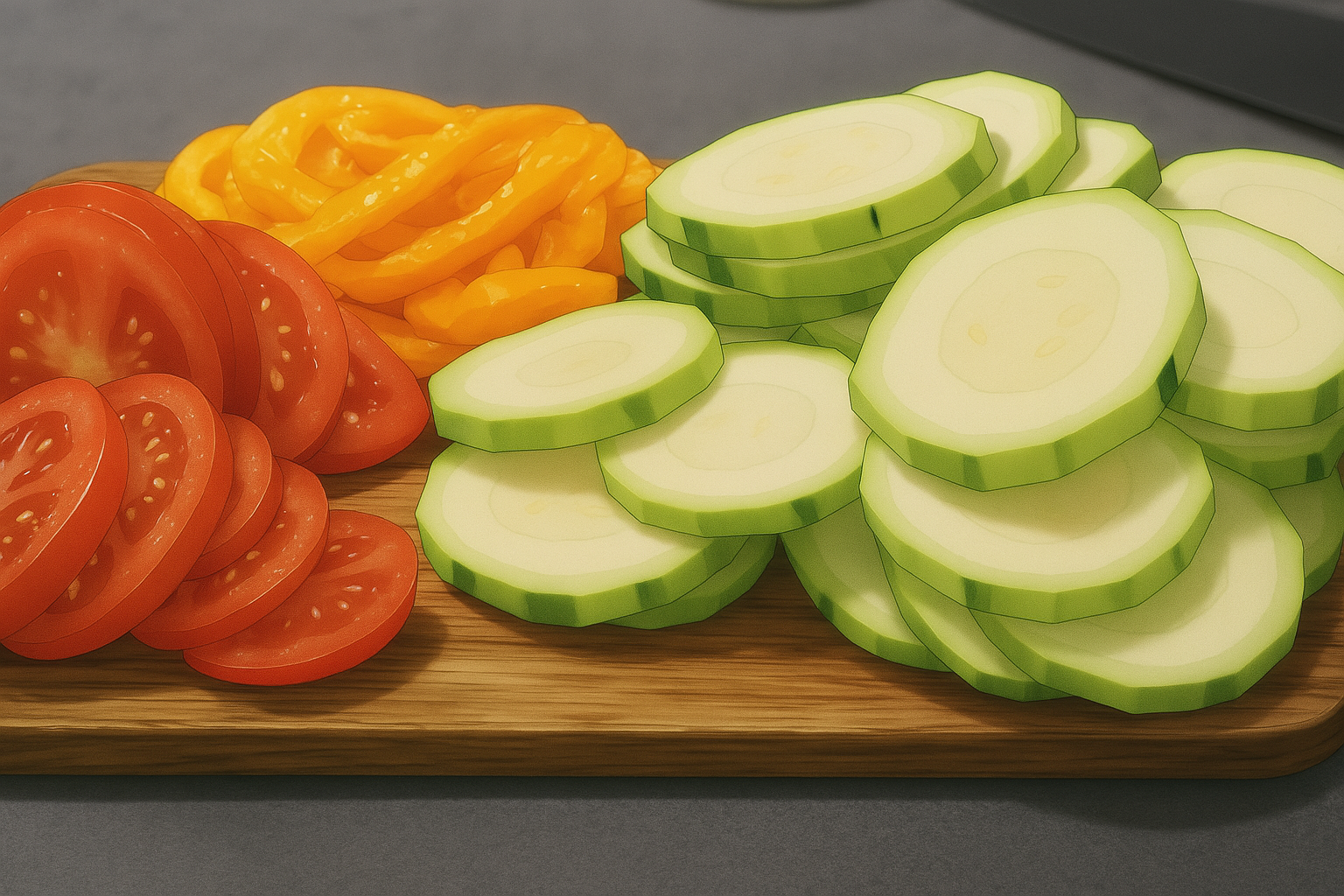 Plānās šķēlītēs sagriež kabaci un tomātus;