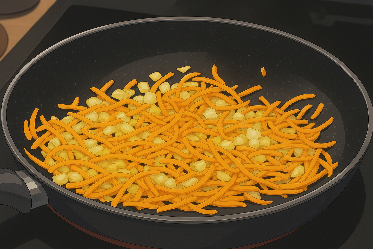 Pannā apcep sasmalcinātu sīpolu un sarīvētu burkānu;