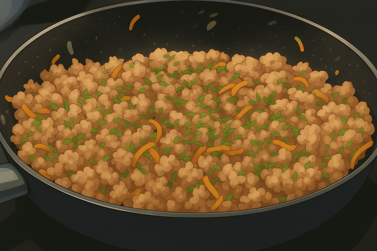 Pievieno malto gaļu, apcep to, pievieno sāli, garšvielas un zaļumus pēc izvēles. Kad gaļa ir apcepta, gaļai pievieno miltus, apmaisa un pannu noņem no uguns;